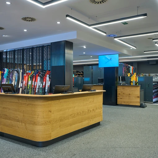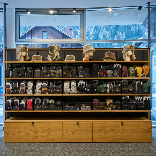 Die Warenpräsentation erfüllt höchste Ansprüche: von ausziehbaren Halterungen für Handschuhe bis hin zu großzügig und flächig beleuchteten Displays für Brillen – jedes Detail wurde auf Funktionalität und ansprechende Optik abgestimmt.