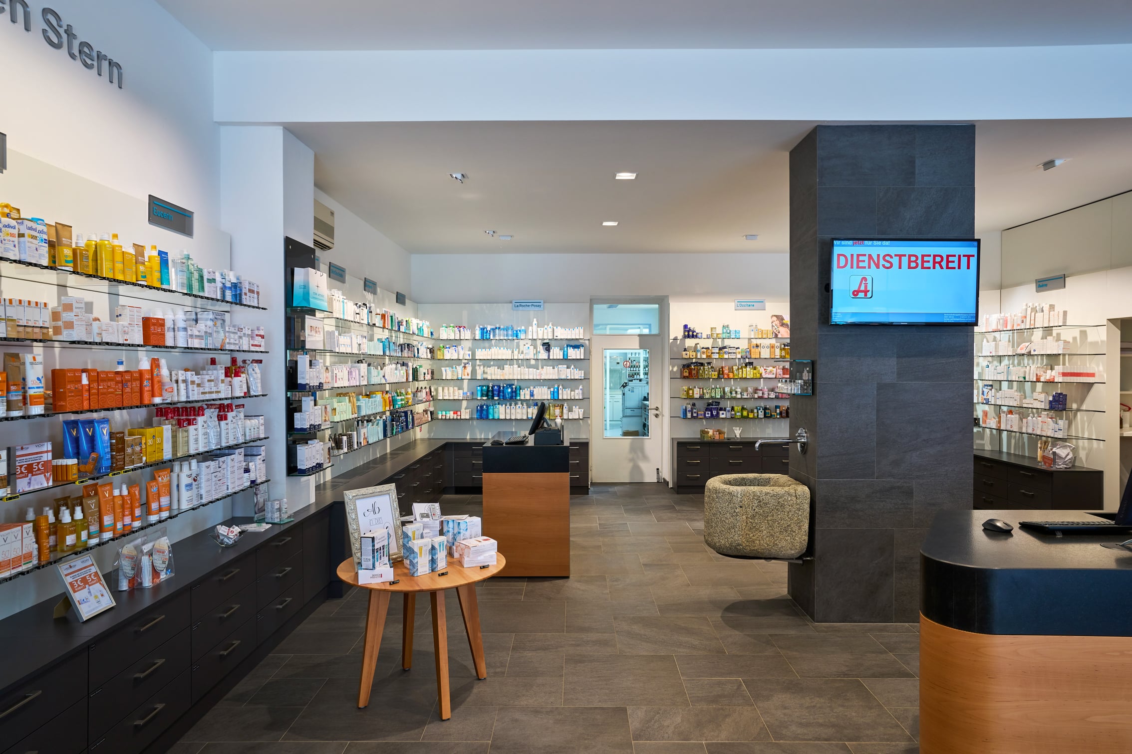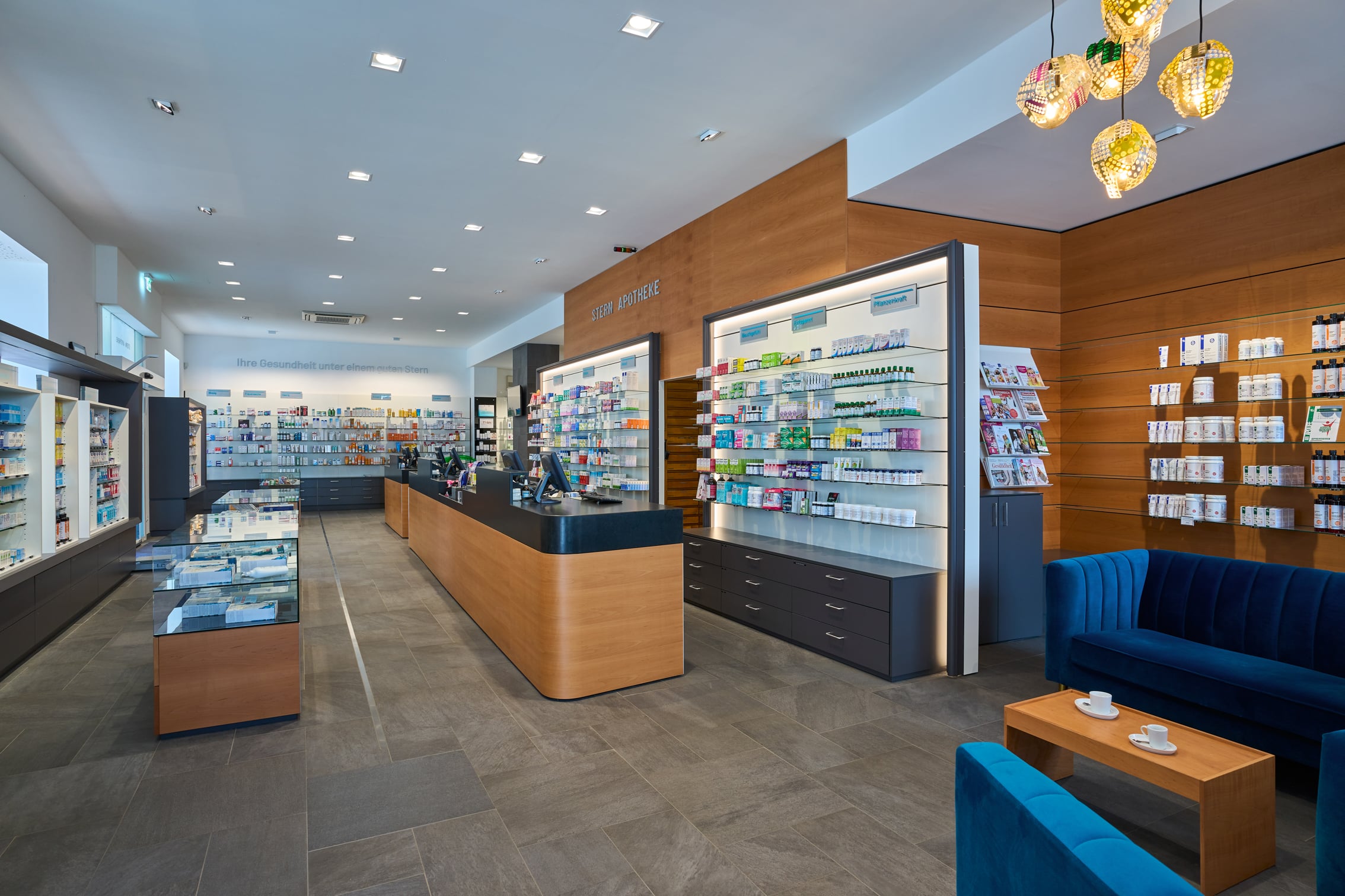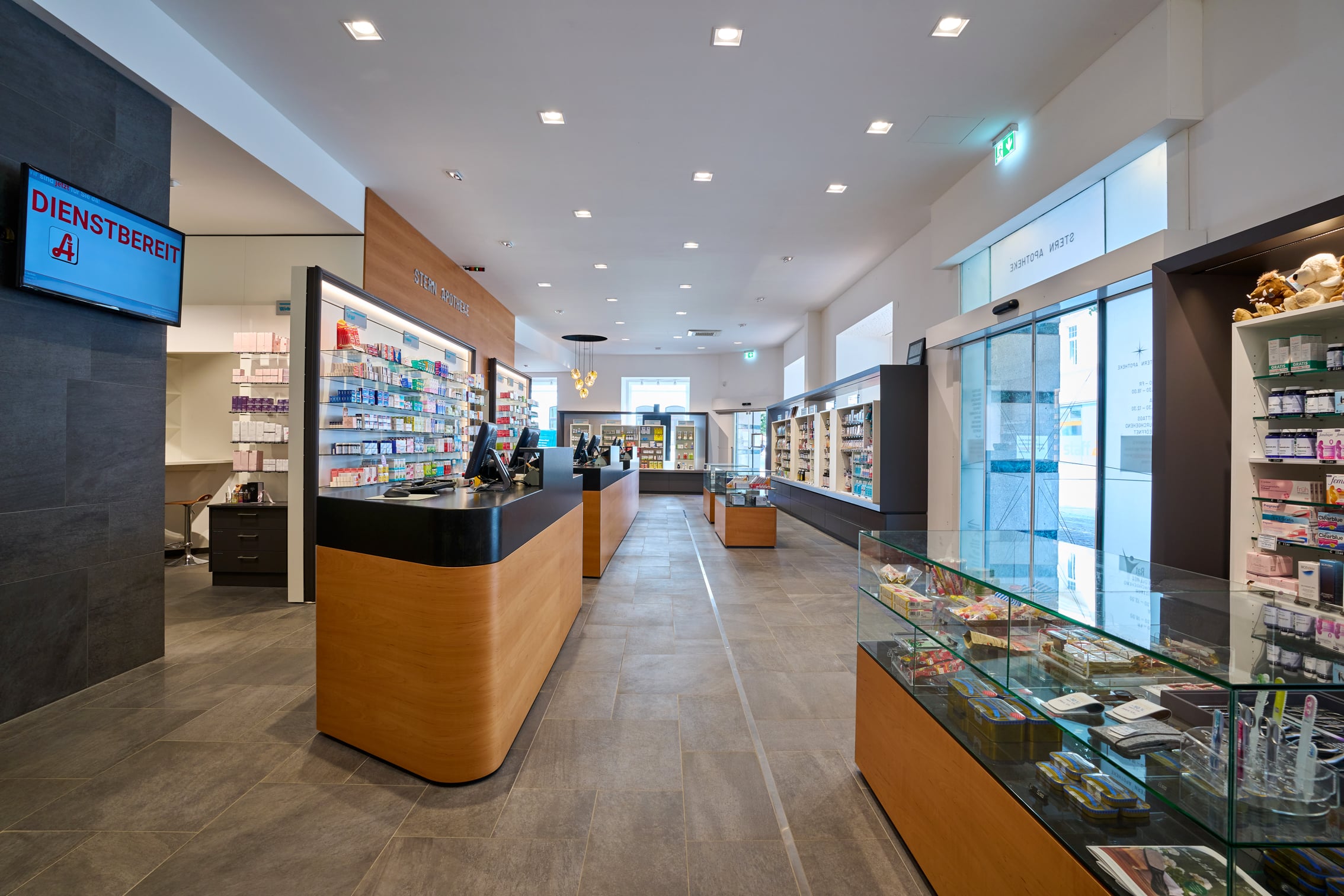 Referenz: Stern Apotheke | Wo: 4600 Wels , Österreich | Verkaufsfläche: mit 350m² | Leistungen: Planung, Produktion und Montage der Geschäftseinrichtung, Gewerke Ausschreibung, Planung und Begleitung